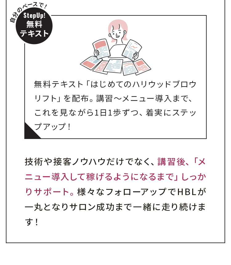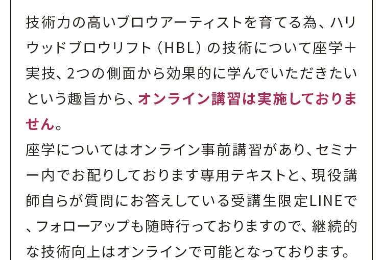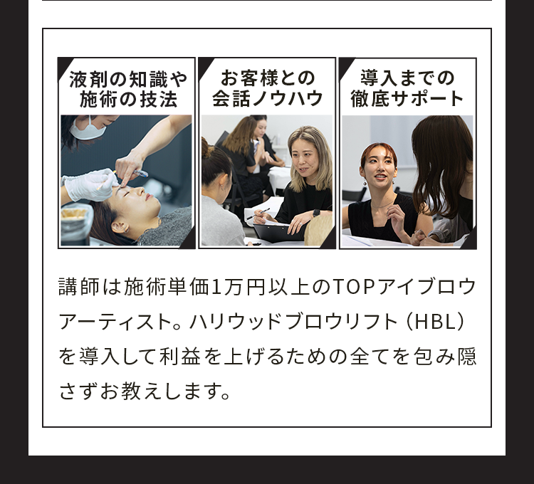 HBL導入後に実現できるメリット ポイント1 同時施術で単価大幅アップ ポイント2 満足度の高い施術でリピート率アップ ポイント3 サロン導入してからも講師がずっと伴走 ポイント4 施術に使われるサロン専売品の提供が可能 ポイント5